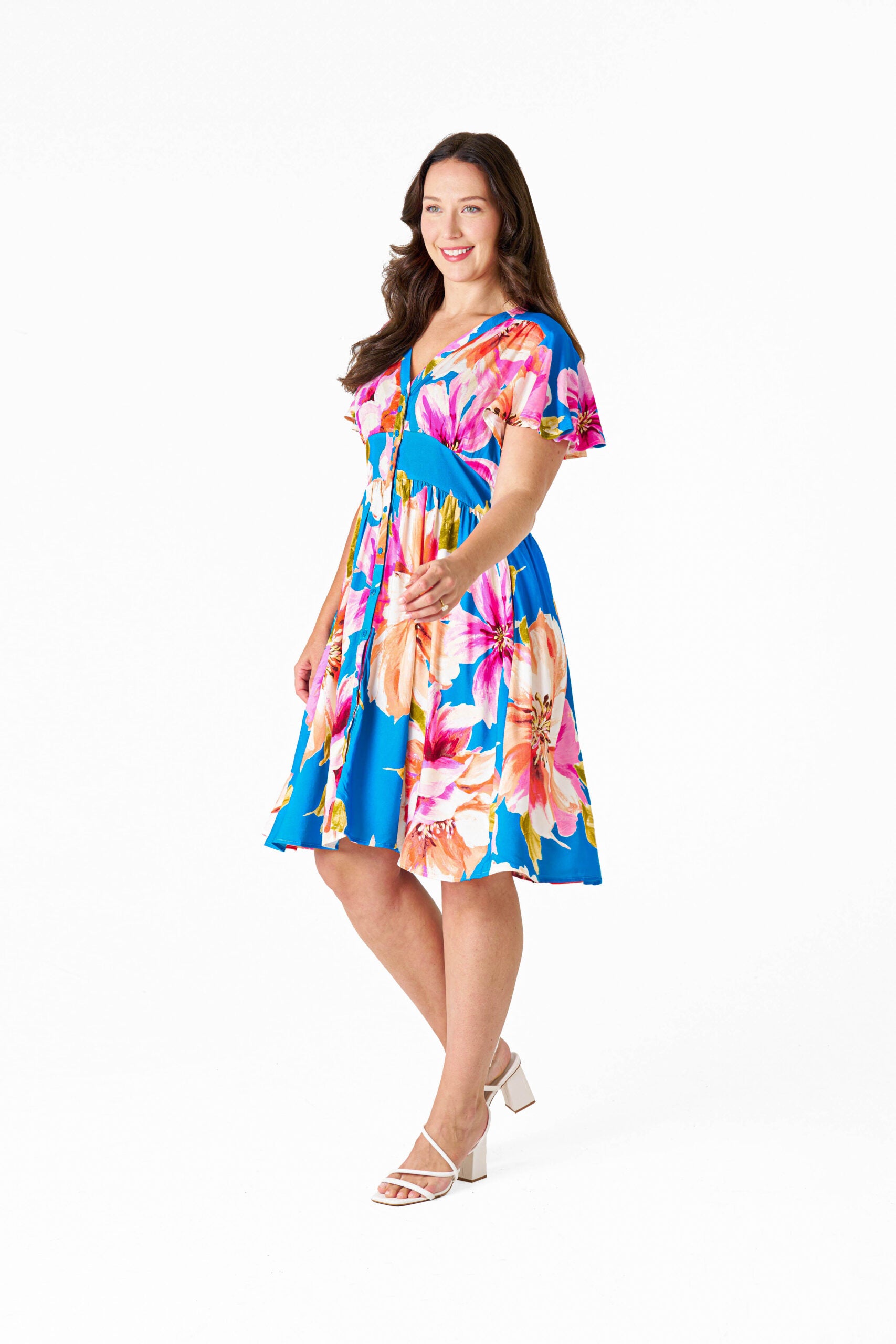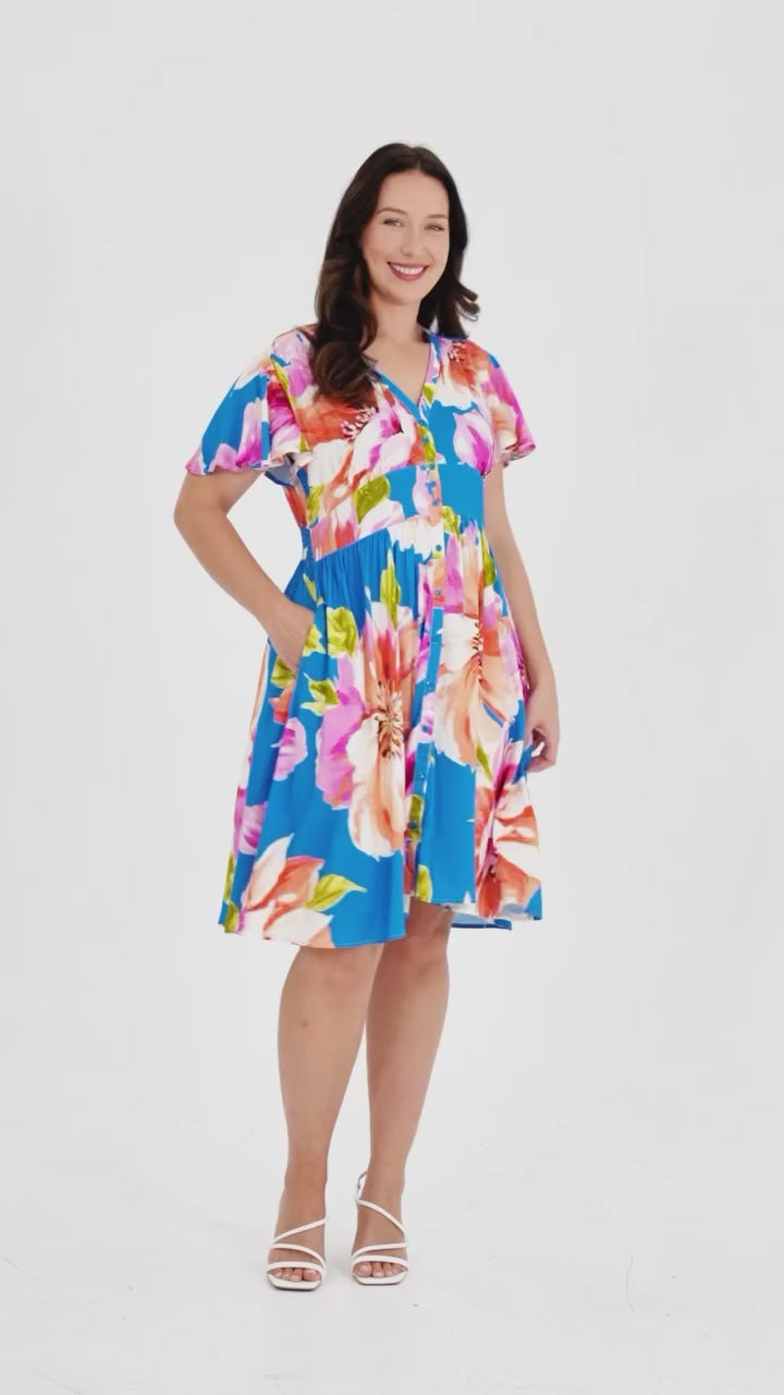 Add a pop of color and personality to your wardrobe! Whether you're running errands or attending a social event, the Ela Dress has you covered with its functional pockets and stylish front buttons. The bold blue and floral print will make a statement and turn heads, while the relaxed fit keeps you comfortable and looking chic.