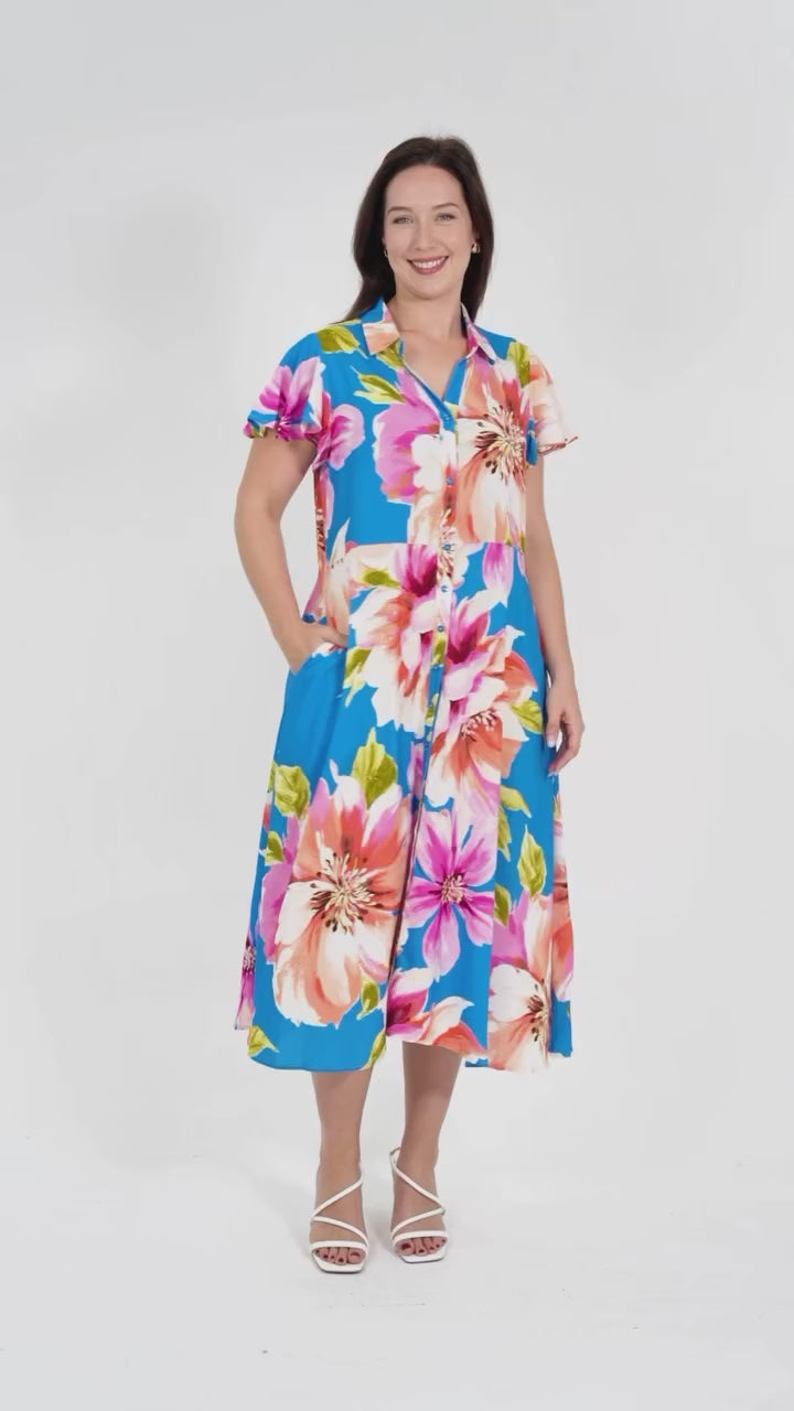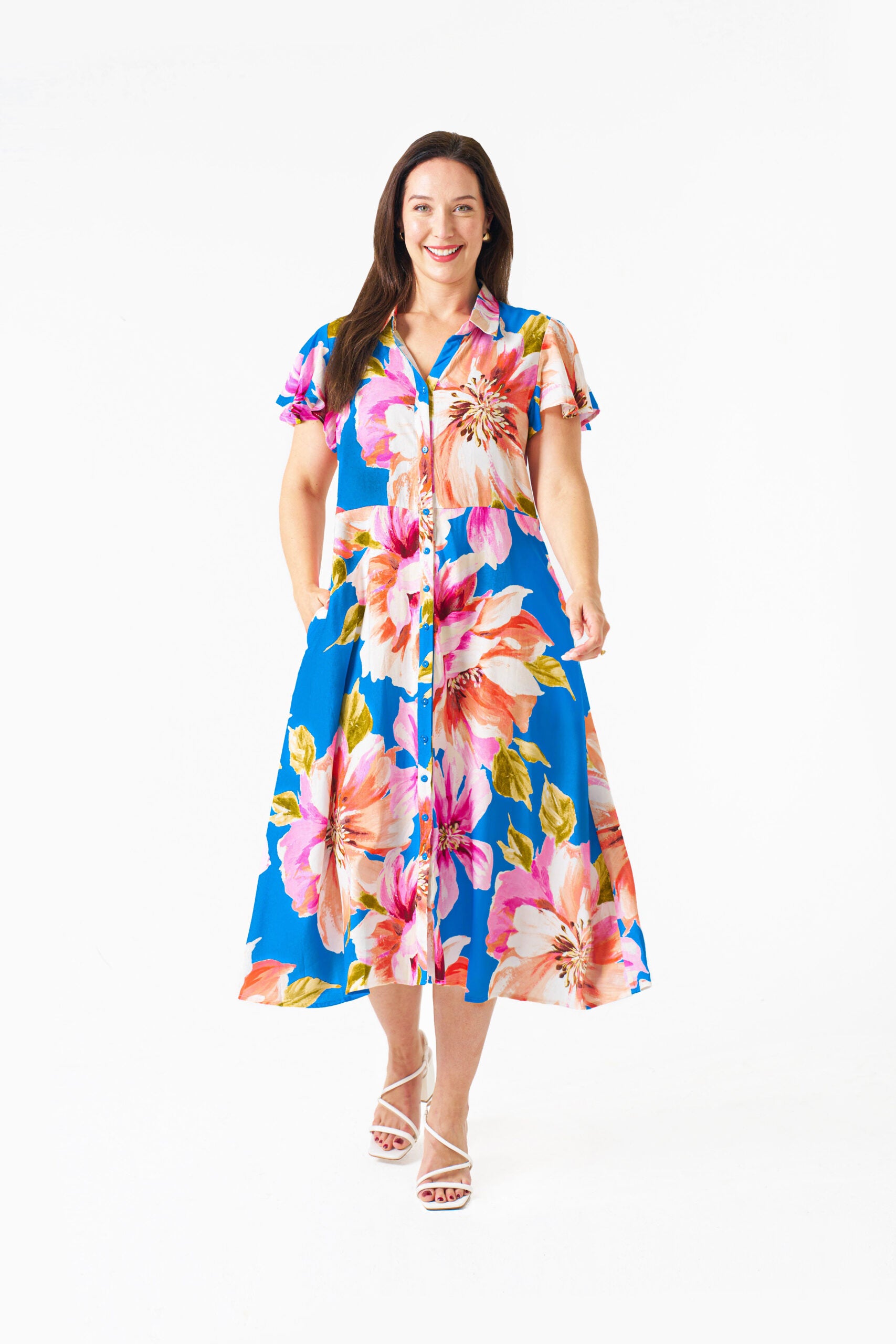 Introducing the Ela Midi Dress, your new go-to for adding a playful twist to your wardrobe! Featuring a bold and eye-catching blue floral print, functional pockets, and stylish front buttons, this dress is both functional and fashionable. From errands to events, the Ela Dress will have you looking chic and turning heads.
