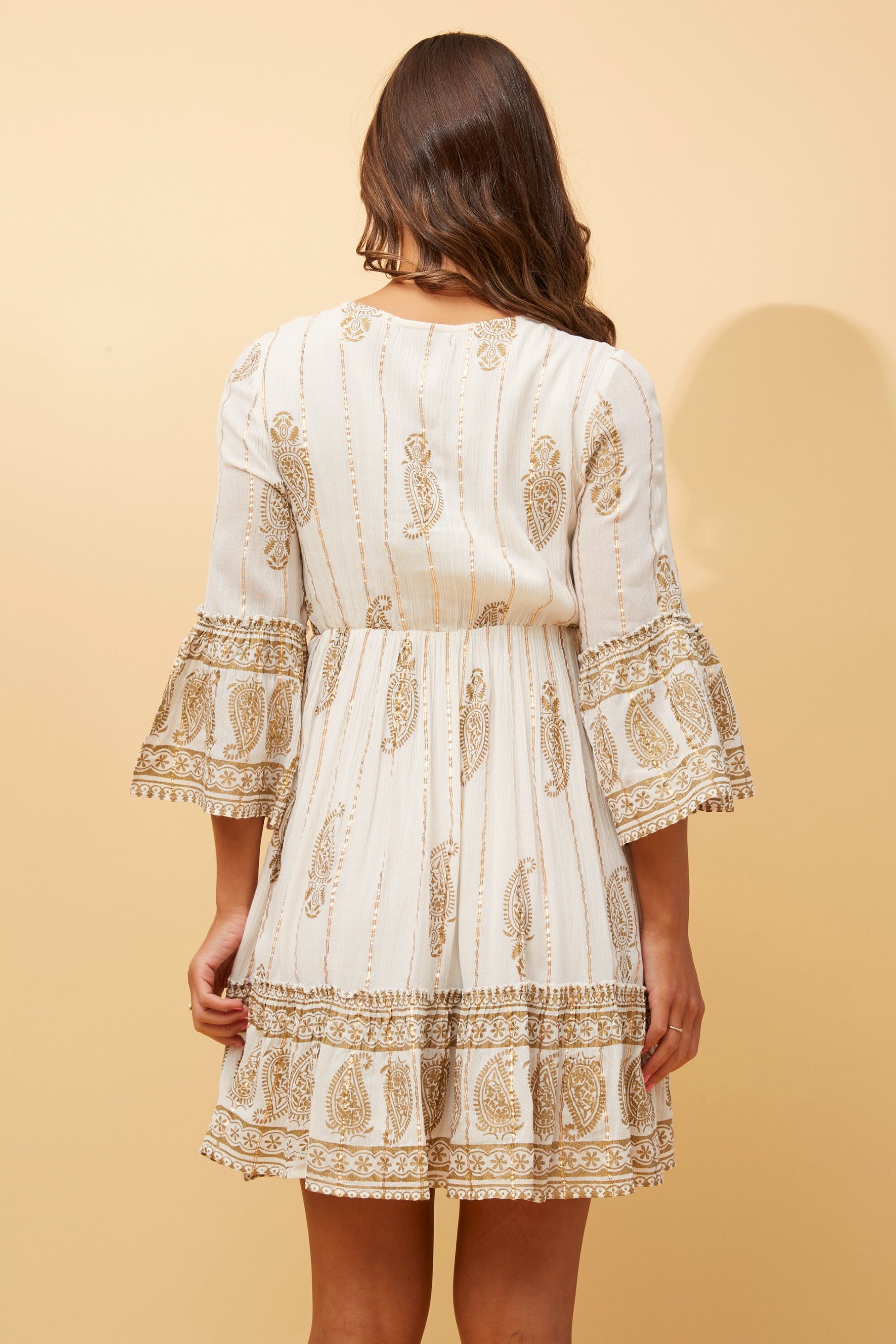 Add a touch of shimmer to your wardrobe with our Geeta paisley print mini dress. This charming dress features gold foil detailing and a tiered silhouette, as well as a split neckline and tiered smocked cuffs with a flare trim. Pair it with sandals and heels for a summer look, and switch to boots in the autumn for a stylish transition. An absolute head turner - Prepare to outshine the crowd (even more than you already do!)